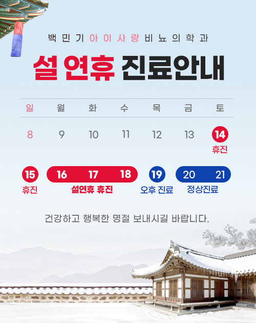 안녕하세요. 2026년 설 연휴를 맞아 진료 일정을 아래와 같이 안내드립니다. 일정을 확인하시어 내원 및 예약에 차질 없으시길 바랍니다. 설 연휴 진료 일정 2월 14일 (토) : 휴진 2월 15일 (일) : 휴진 2월 16일 (월) ~ 18일 (수) : 설 연휴 휴진 2월 19일 (목) : 오전 휴진 / 오후 2시부터 진료 시작 2월 20일 (금) : 정상진료 2월 21일 (토) : 정상진료